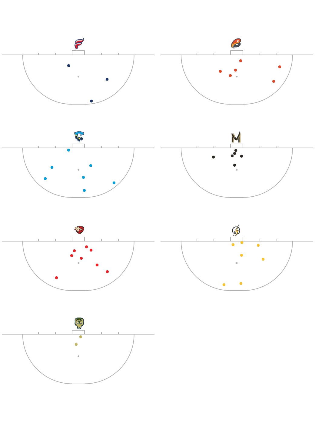 There have been 39 field goals scored after six rounds of the Hockey One League (M). This is a small sample size but it is sufficient to start generating insight into goal-shooting patterns in the competition. To do this, we have collected and plotted the approximate shot locations for all field goals scored by each team in the competition (see Figure 1).