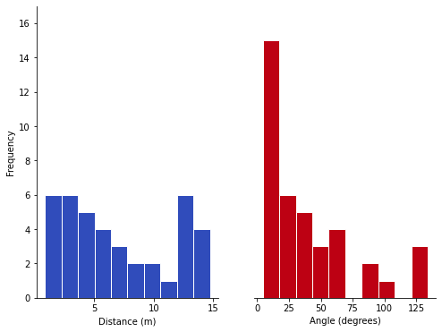 Figure 5: Histogram of the distance and angle of goal-scoring shots